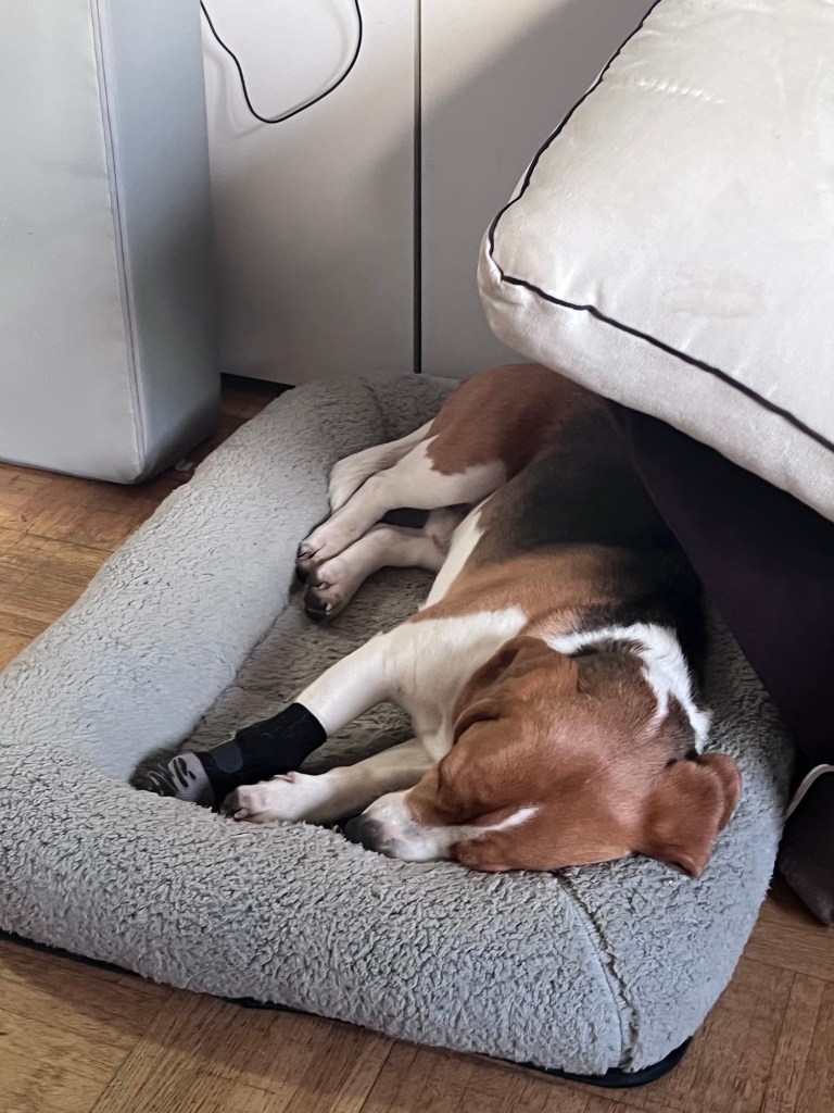 Meine Pfote steckt immer noch in Socken. Es heilt, aber sehr langsam. Ich würd am liebsten die ganze Zeit darauf herumschlecken. Das soll ich aber nicht darum die doofe Socke. Und im Garten muss ich einen Schuh anziehen.