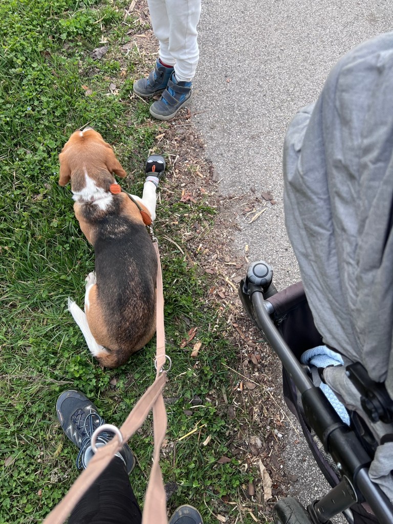 Heute waren wir schon eine große Runde spazieren aber ich bin immer noch sehr müde von gestern. Herrli versucht sich bei mir mit Leberwurst beliebt zu machen.