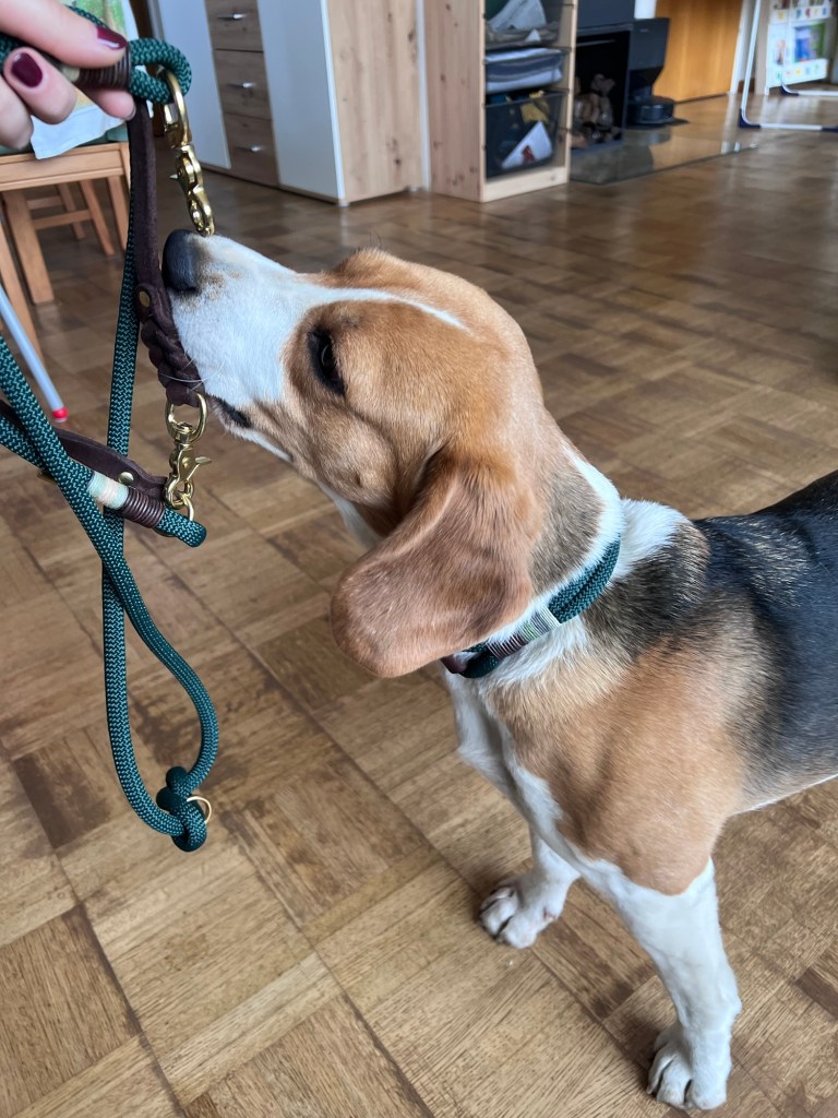 Ich habe auch ein schönes neues Halsband und eine Leine bekommen. Frauli‘s Lieblingsfarbe hat sie gesagt. Mir persönlich ist das ja eher egal, Hauptsache bequem.