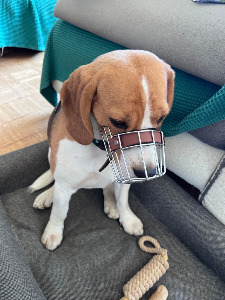 Den Maulkorb tragen übt Lena jeden Tag einmal mit mir. Dafür gibt es sehr viel Leberwurst zum Schlecken.