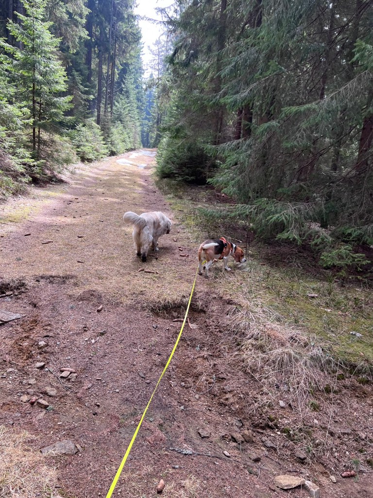 Beim spazieren gehe ich grundsätzlich brav an der Leine mit. Neben dem Kinderwagen bin ich auch ruhig aber oft genug ist mir diese doofe Leine dann zu kurz und ich ziehe ein bisschen. Andere Hunde würd ich immer gern begrüßen. Bei einigen geht es gaaaanz schwer, dass wir vorbei gehen, bei anderen leichter. Wenn wir mit anderen gemeinsam spazieren gehen bin ich zu 80% brav ohne dass ich ständig zu den anderen hin muss. Bei unserer ersten Wanderung (Hebalmseerunde) hat uns ein unbekannter Golden Retriever einfach begleitet und das hat mich nicht aufgeregt. Ich bin halt ein Meute Hund.