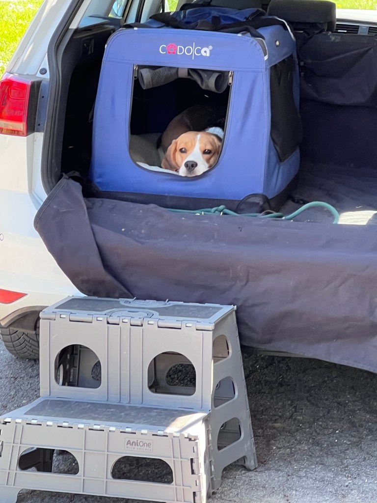 Am Freitag hat Frauchen dann auch noch angefangen Sachen einzupacken. Ich hab mir schon die ganze Woche gedacht, das was los ist weil sie von Oma, Opa und Auto gesprochen hat. Samstag war dann auch anders als sonst. Herrli ist ganz bald in der Früh weggefahren und Lena war nicht mit mir auf unserer Morgenrunde sondern nur im Garten. Sie hat Sachen ins Auto gepackt. Wir haben am Vormittag noch viel im Garten gespielt und dann musste ich ins Auto. Das war eine sehr lange Fahrt aber zum Glück nicht sehr kurvig. Und jetzt sind wir im Haus wo Oma und Opa wohnen. Ich weiß nicht obs mir hier gefällt. Frauli sagt ich muss an der Leine bleiben weil es keinen Zaun gibt. Sie hat mir jetzt ein neues Geschirr gekauft aus dem ich nicht rausschlüpfen kann. Und mit dem bin ich im Garten angeleint. So ist es eh fein hier, mir wär’s halt lieber wenn ich einfach herumlaufen könnte so wie daheim.